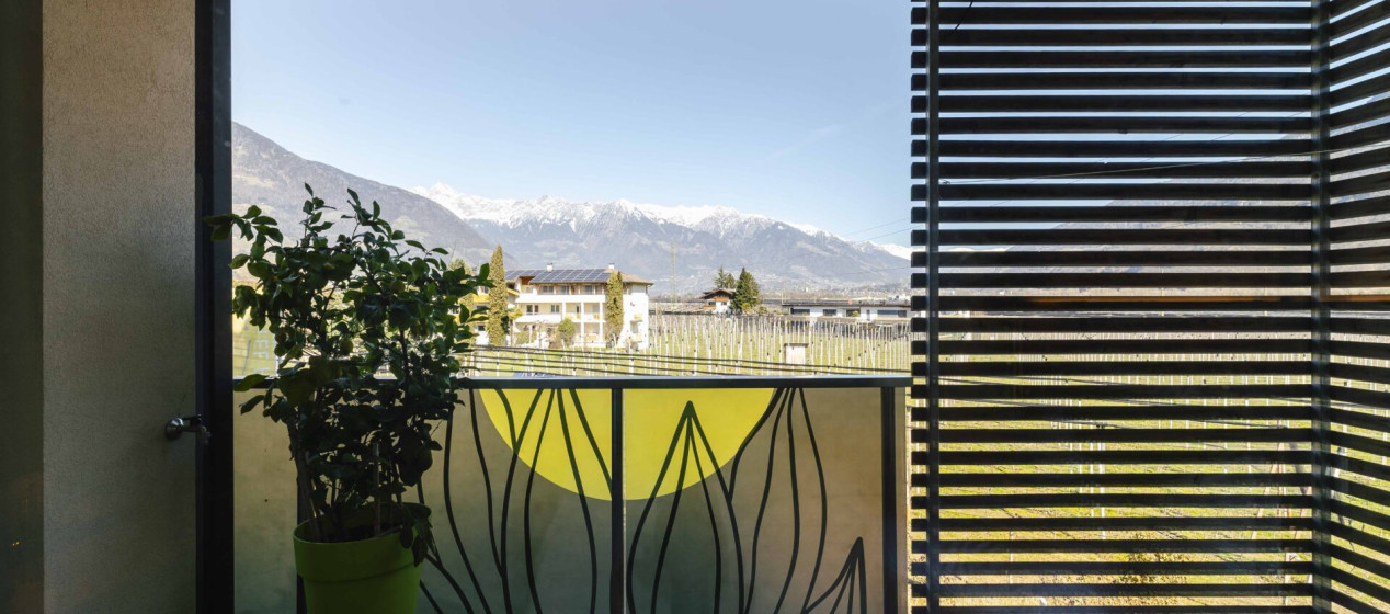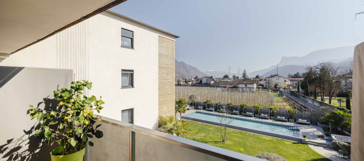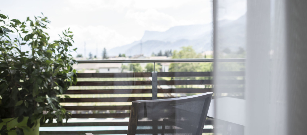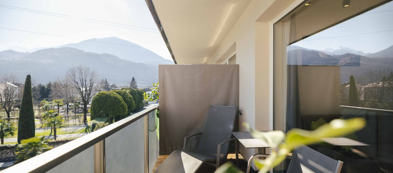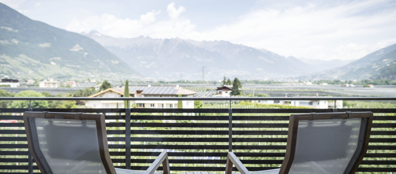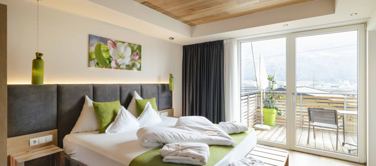 Komfortabel und modern: Doppelzimmer – auch barrierefrei verfügbar – mit Sitzecke und Schreibtisch, Balkon mit wunderbarer Aussicht auf Lana und das Vigiljoch; WLAN, TV, Safe, Kühlschrank, Klimaanlage und Badezimmer mit Regendusche und Föhn.