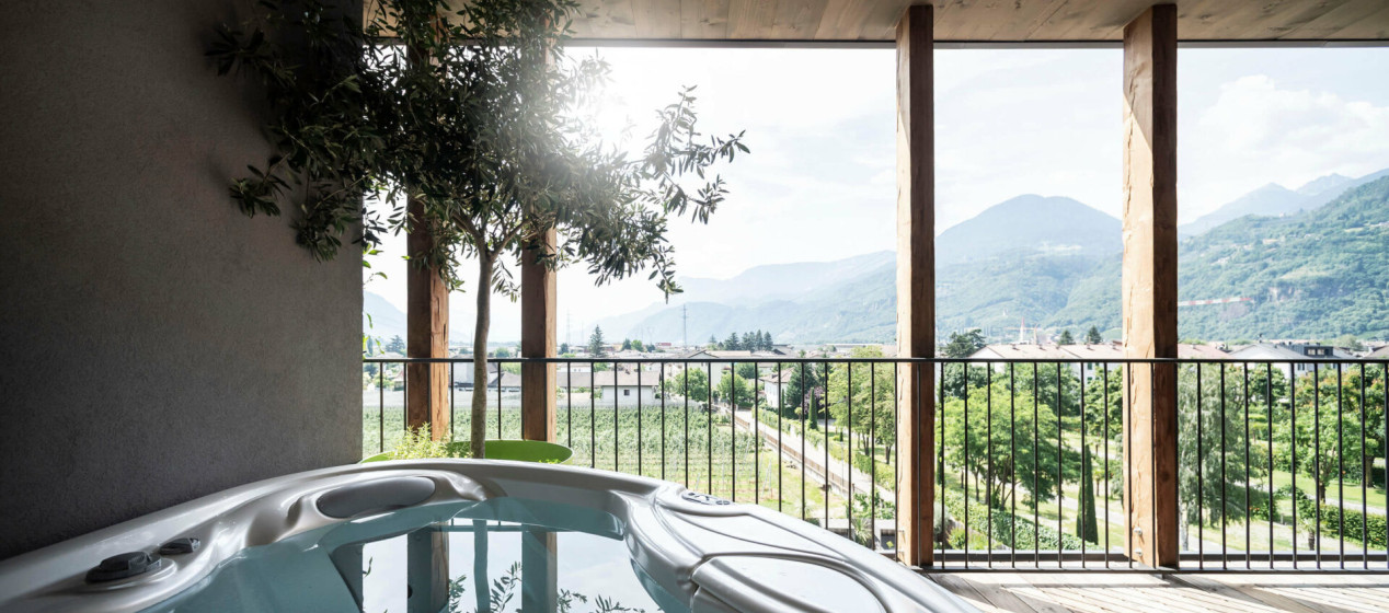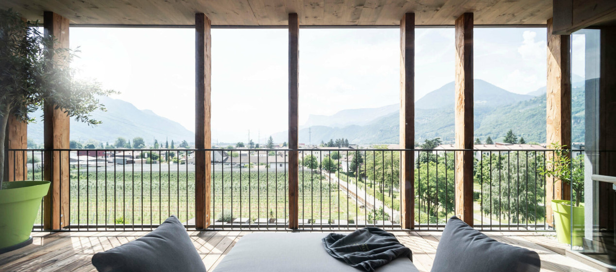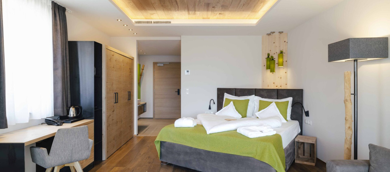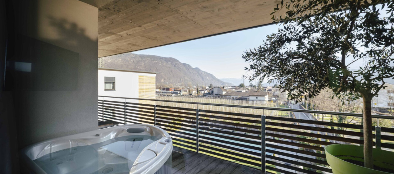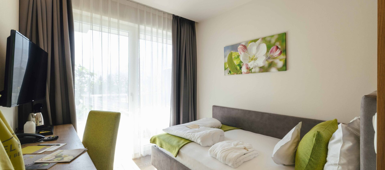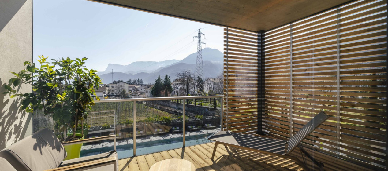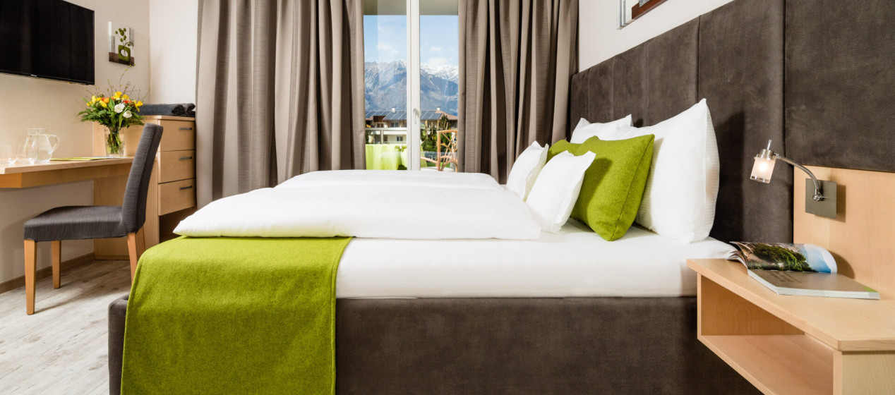 Komfortabel und modern: Doppelzimmer – auch barrierefrei verfügbar – mit Sitzecke und Schreibtisch, Balkon mit wunderbarer Aussicht auf Lana und das Vigiljoch; WLAN, TV, Safe, Kühlschrank, Klimaanlage und Badezimmer mit Regendusche und Föhn.