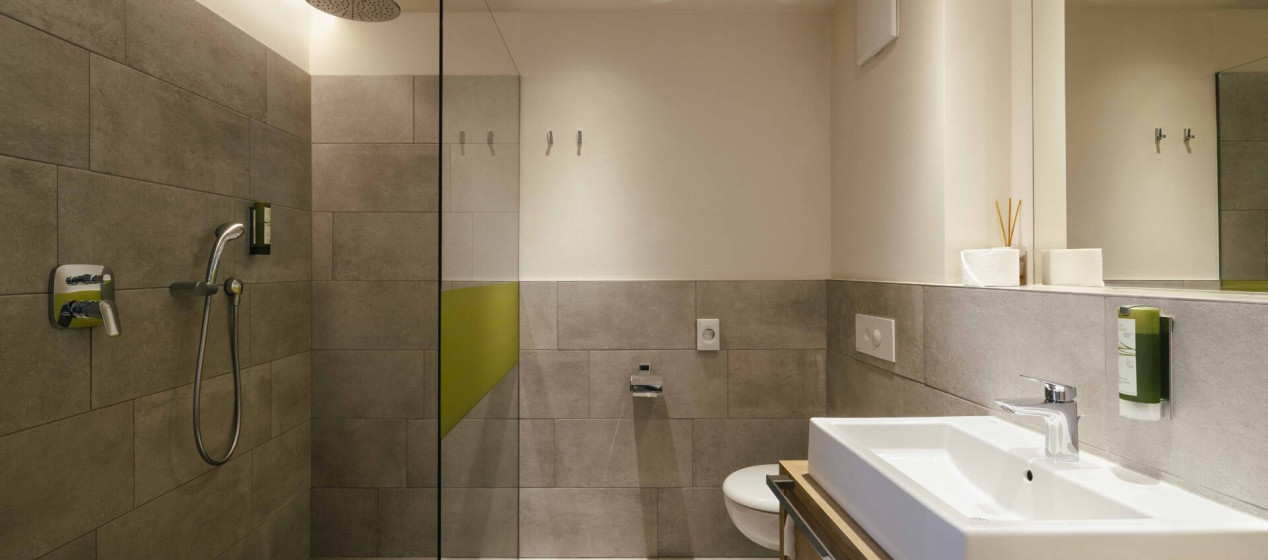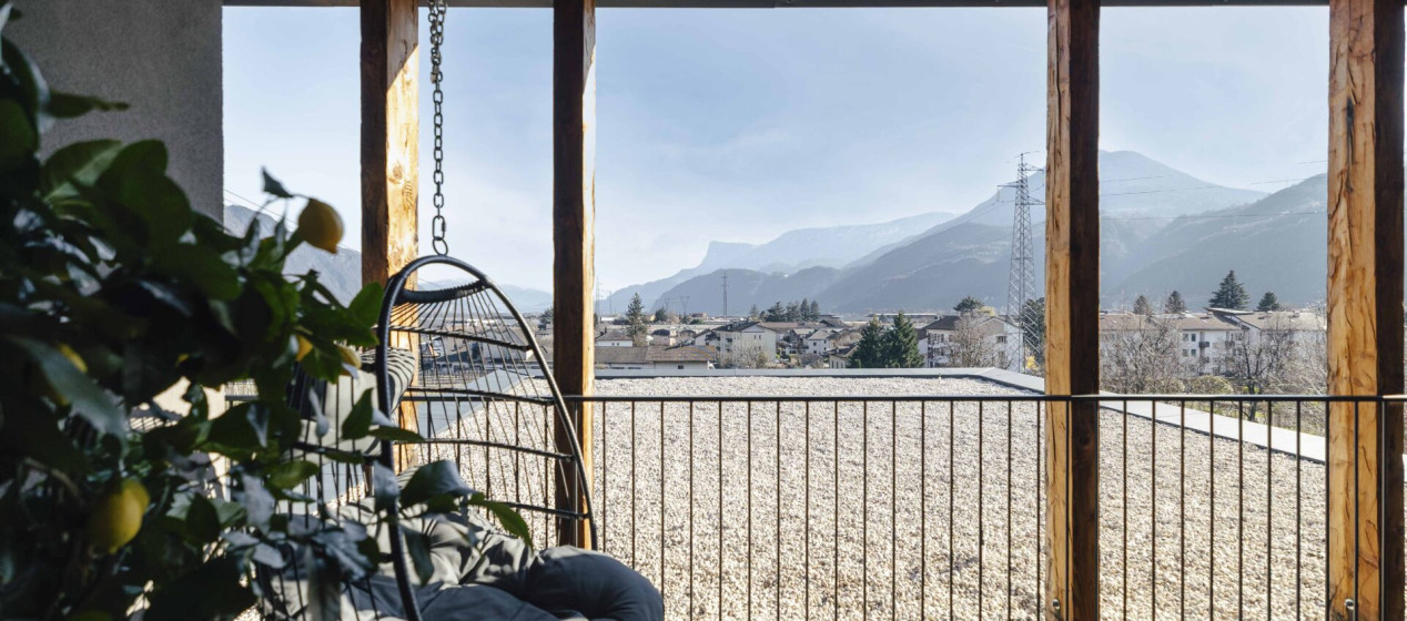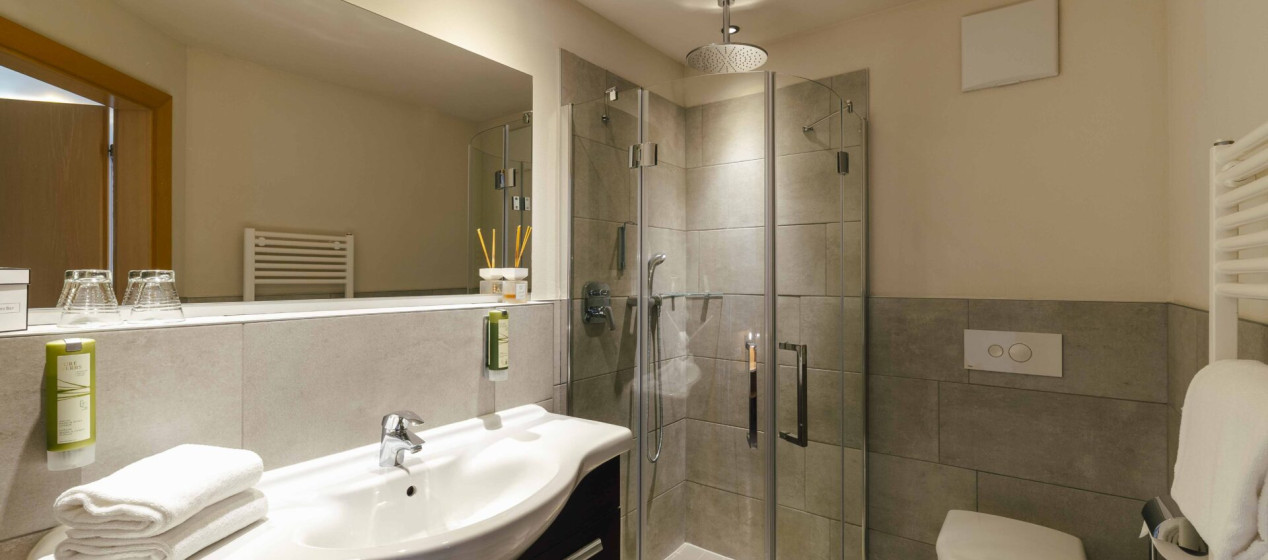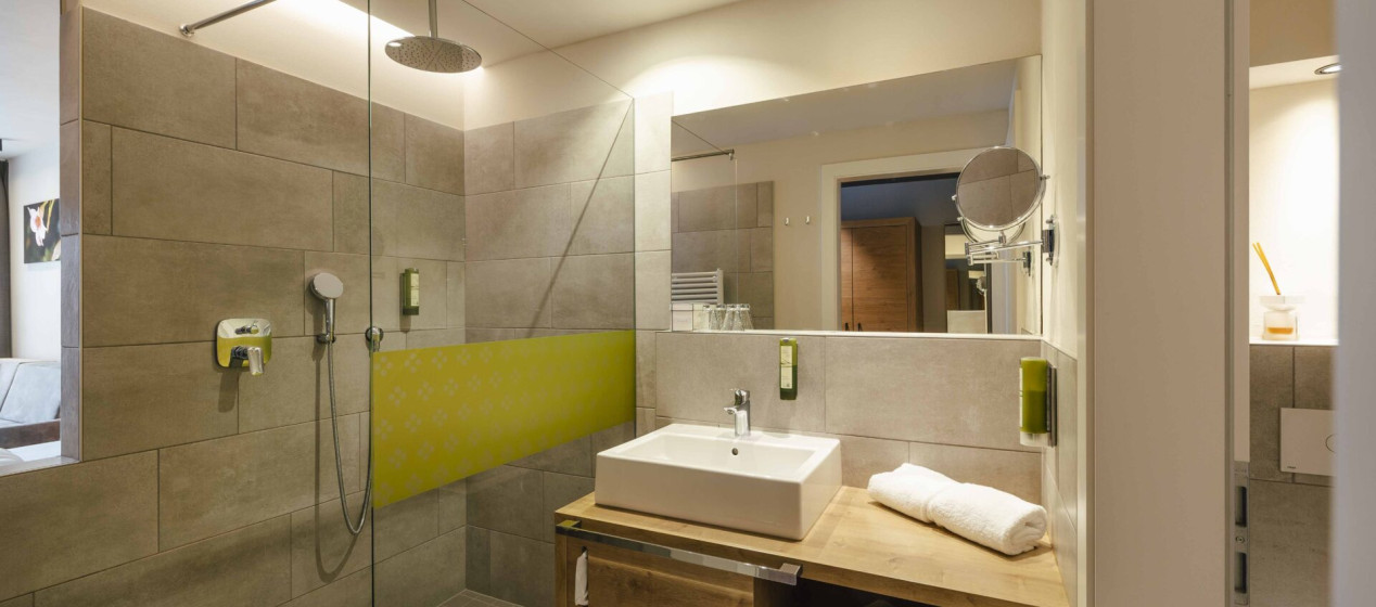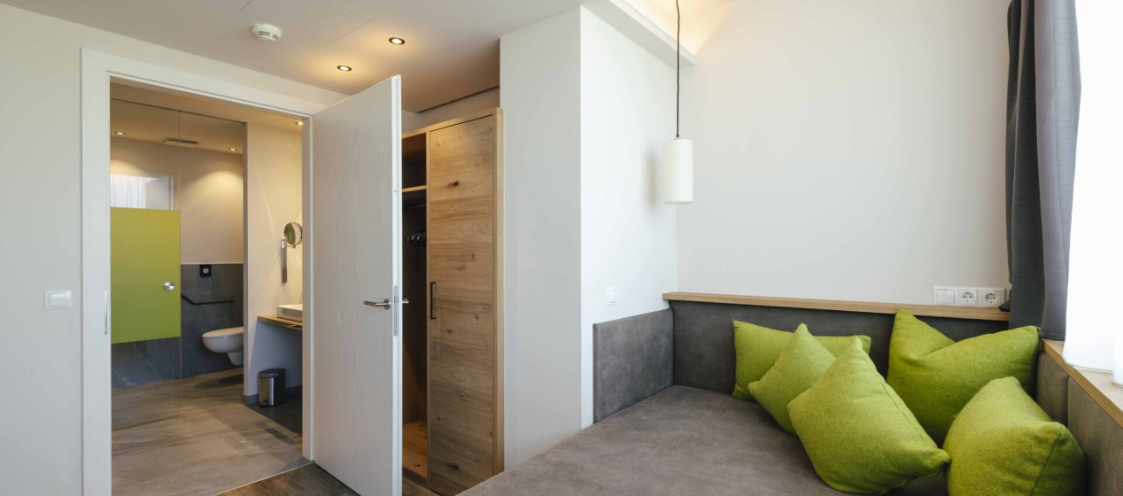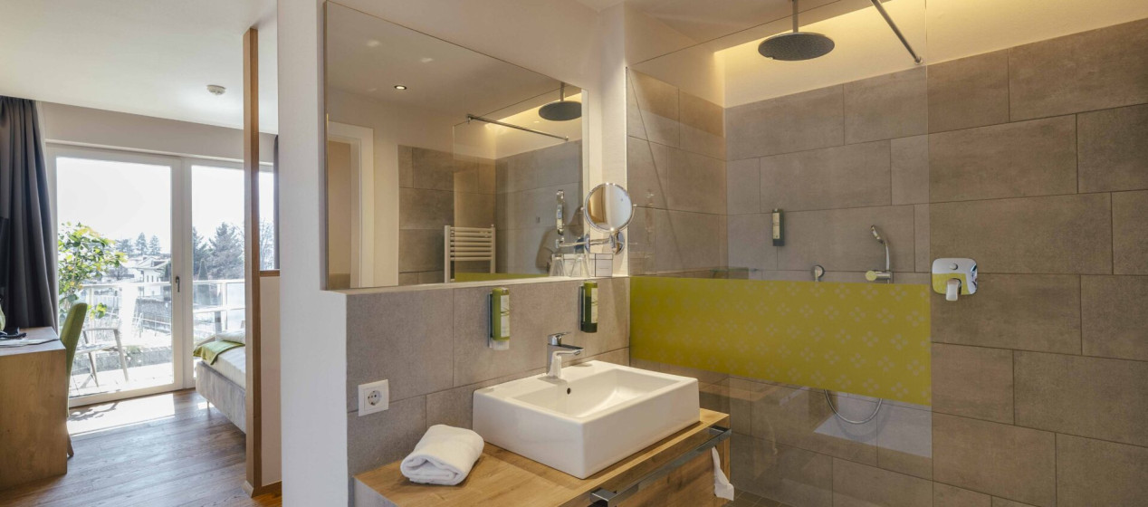 Komfortabel und modern: Doppelzimmer – auch barrierefrei verfügbar – mit Sitzecke und Schreibtisch, Balkon mit wunderbarer Aussicht auf Lana und das Vigiljoch; WLAN, TV, Safe, Kühlschrank, Klimaanlage und Badezimmer mit Regendusche und Föhn.