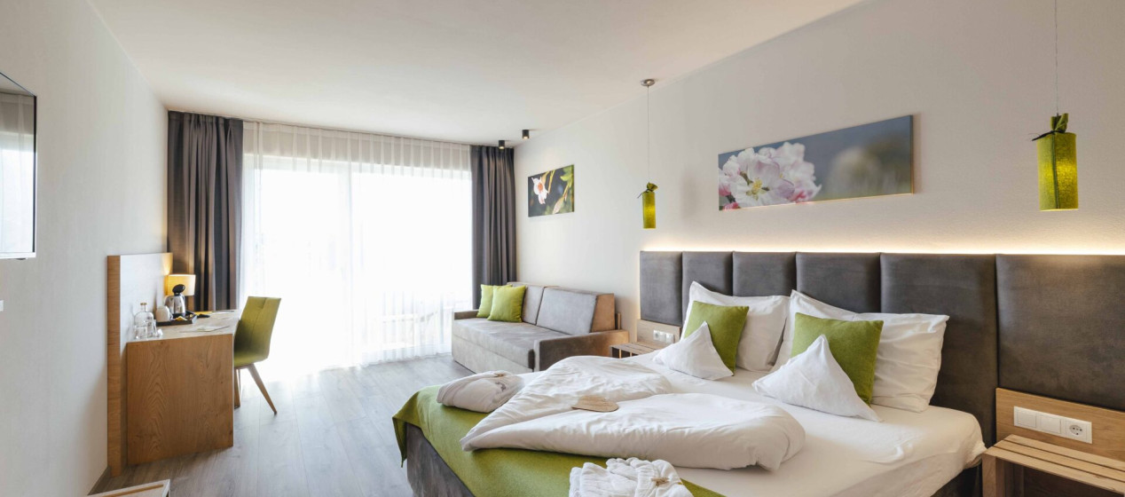 Sonnig und geräumig: Zimmer mit Doppelbett und gemütlichem Sofa zum Entspannen, Panorama-Loungeecke auf dem großzügigen Südbalkon, modernem Badezimmer samt Regendusche und separatem WC und Bidet (teils barrierefrei erhältlich), ausgestattet mit Klimaanlage, Kühlschrank, Tee-Set, Espressomaschine, TV, Safe, Föhn und WLAN.