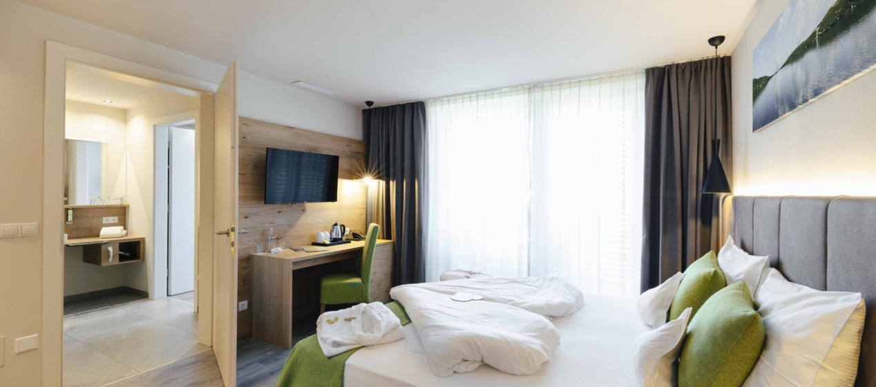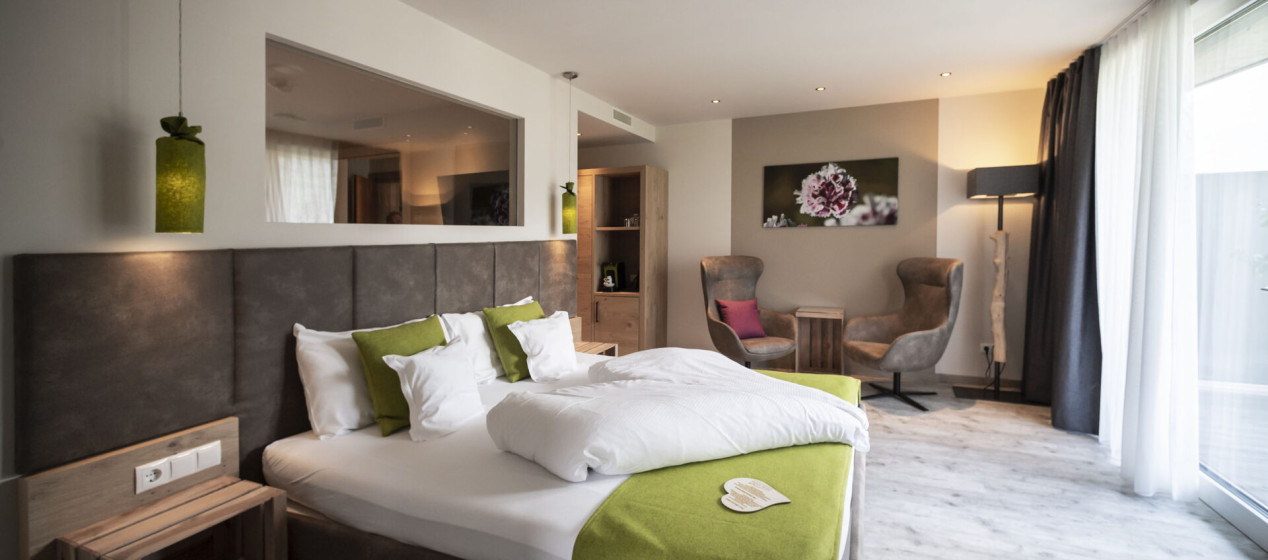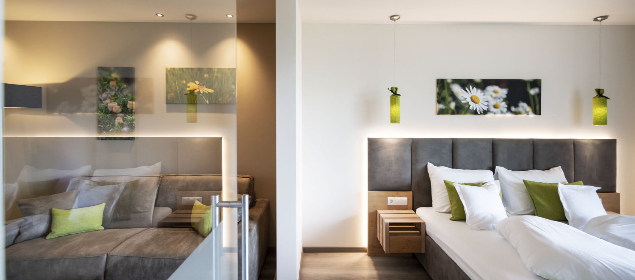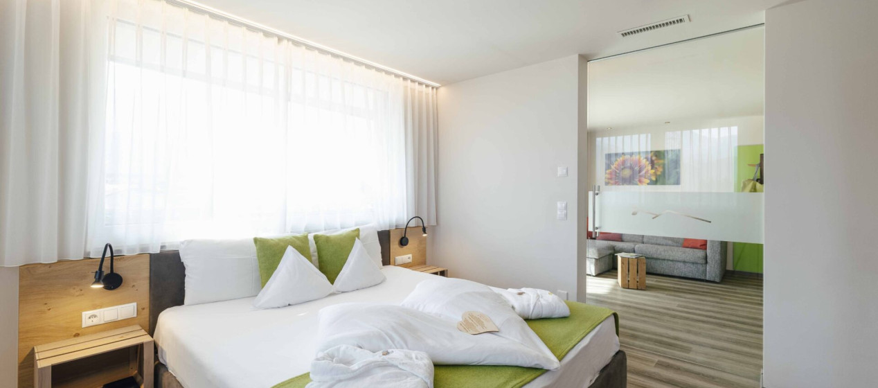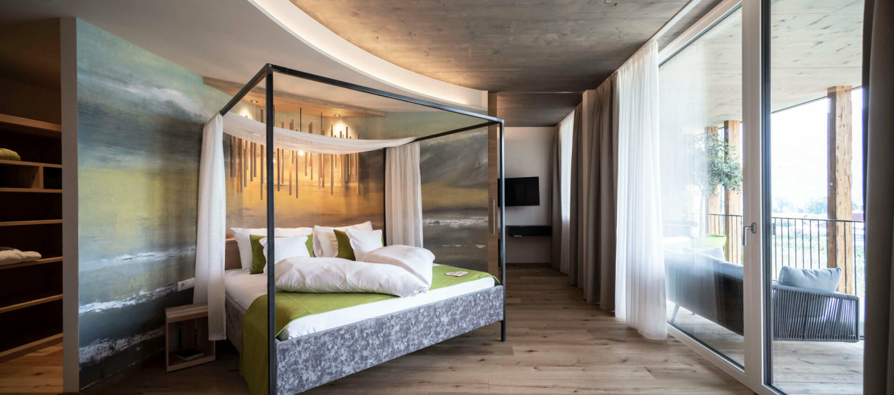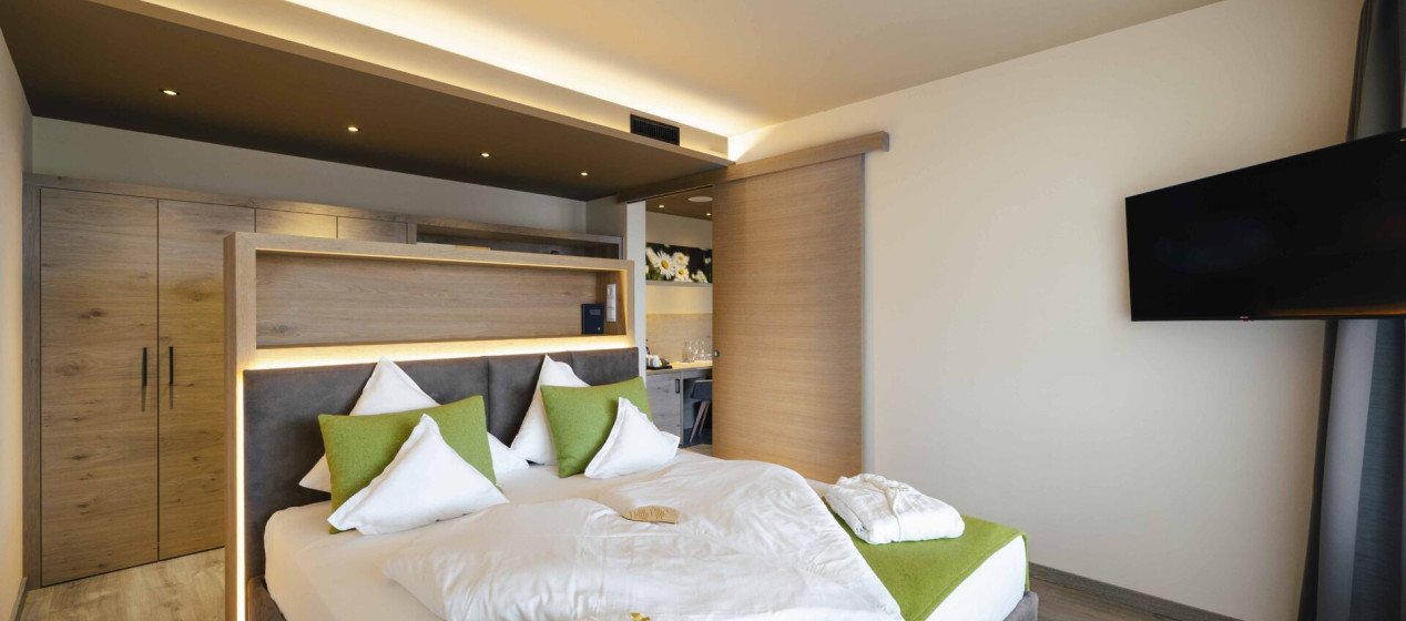 Romantisch und gemütlich: Großzügige Juniorsuite mit Doppelbett und abgetrenntem Wohnraum, Panoramablick und kuscheligen Hängeliegen auf dem geräumigen Balkon für romantische Stunden zu Zweit. Weiters ausgestattet mit einem eleganten Badezimmer mit Regendusche und teilweise Bidet, natürlich mit Kühlschrank, Tee-Set, Espressomaschine, 2 TVs, Safe, Föhn, WLAN und Klimaanlage