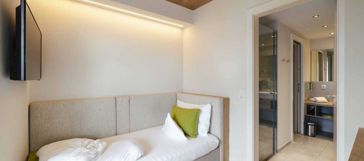 Modernes Einzelzimmer: Panoramabalkon mit Blick auf die umliegende Landschaft; WLAN, TV, Kühlschrank, Safe, Klimaanlage und Badezimmer mit Regendusche und Föhn.