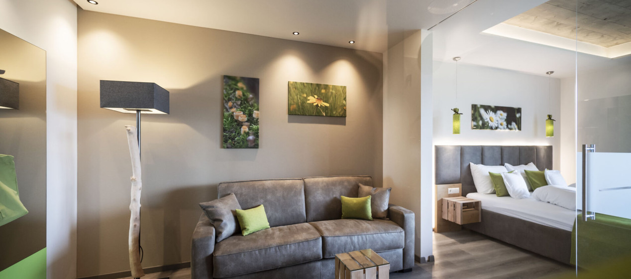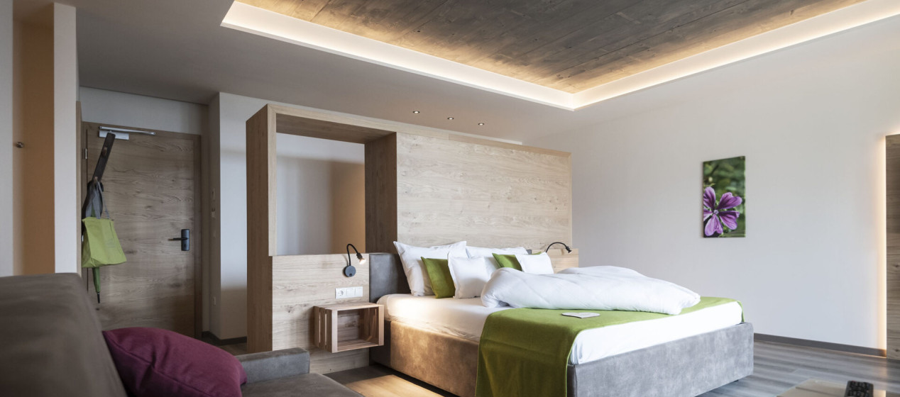 Geräumig und elegant: Südzimmer mit Doppelbett und gemütlichem Sofa zum Entspannen mit modernem Badezimmer samt Regendusche und separatem WC, ausgestattet mit Klimaanlage, Kühlschrank, Tee-Set, TV, Safe, Föhn, WLAN und Poolblick.