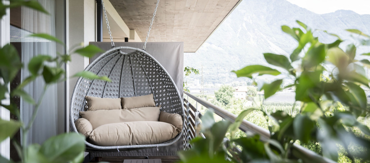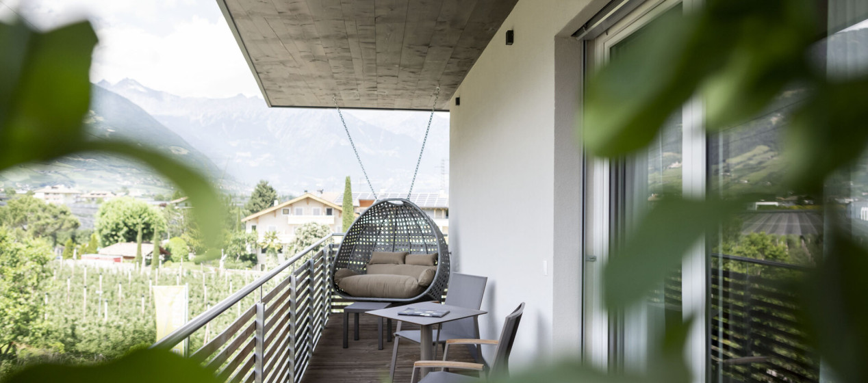 Wohnlich und komfortabel: Wohlfühlsuite mit Schlafzimmer und abgetrenntem Wohnraum, dazu ein modernes Badezimmer mit Erlebnisdusche und Bidet. Highlight ist der gemütliche Balkon samt Design-Schaukelstühlen mit Blick auf die Stadt Meran und die dahinter liegende, atemberaubende Texelgruppe. Weiters ausgestattet mit Kühlschrank, Teeset, 2 TV, Safe, Föhn, WLAN und Klimaanlage.