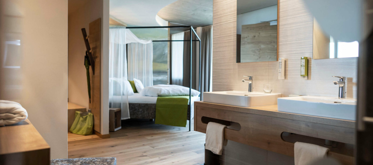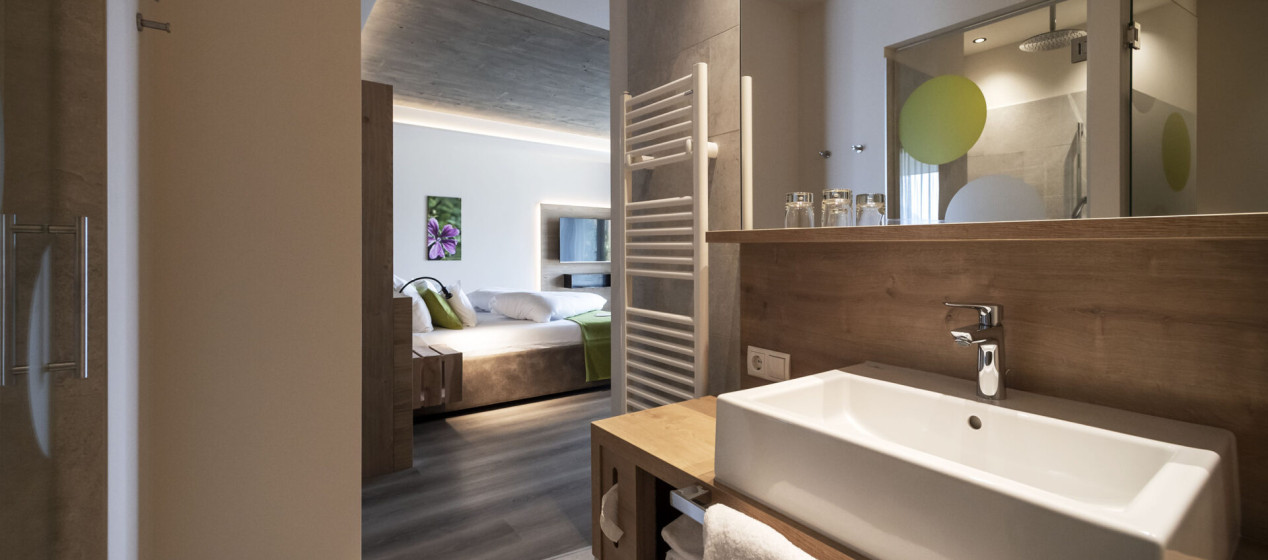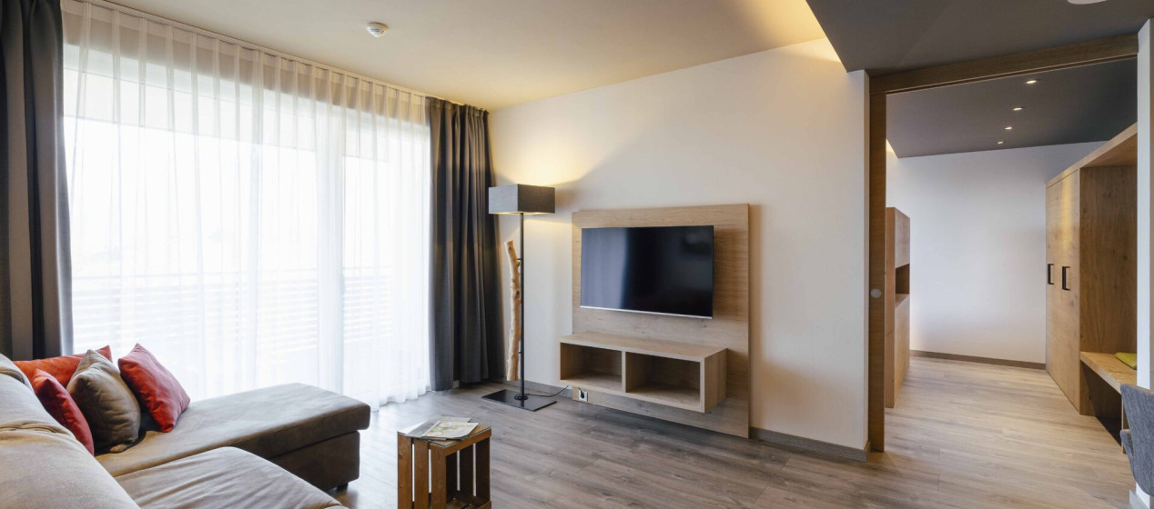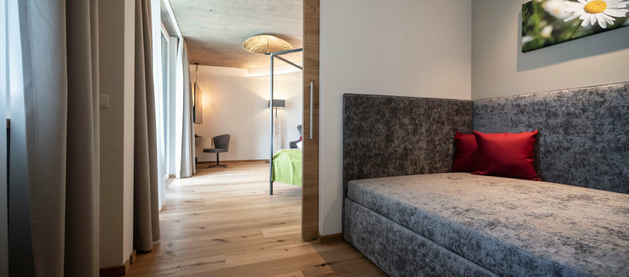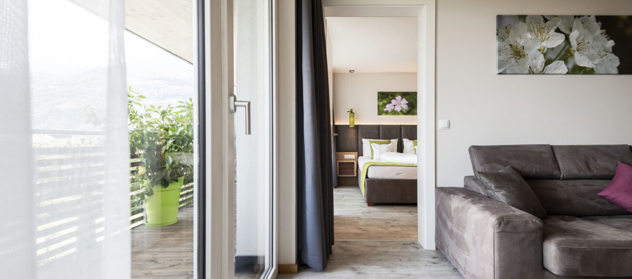 Doppelbettzimmer mit zweitem Schlafraum, Bettbreite 1,10m. Badezimmer samt Regendusche und separatem WC, teilweise Bidet, ausgestattet mit Klimaanlage, Kühlschrank, 2 TV, Tee-Set, Safe, Föhn, W-Lan und Panoramabalkon mit Blick auf die Bergwelt Richtung Meran und Passeier.